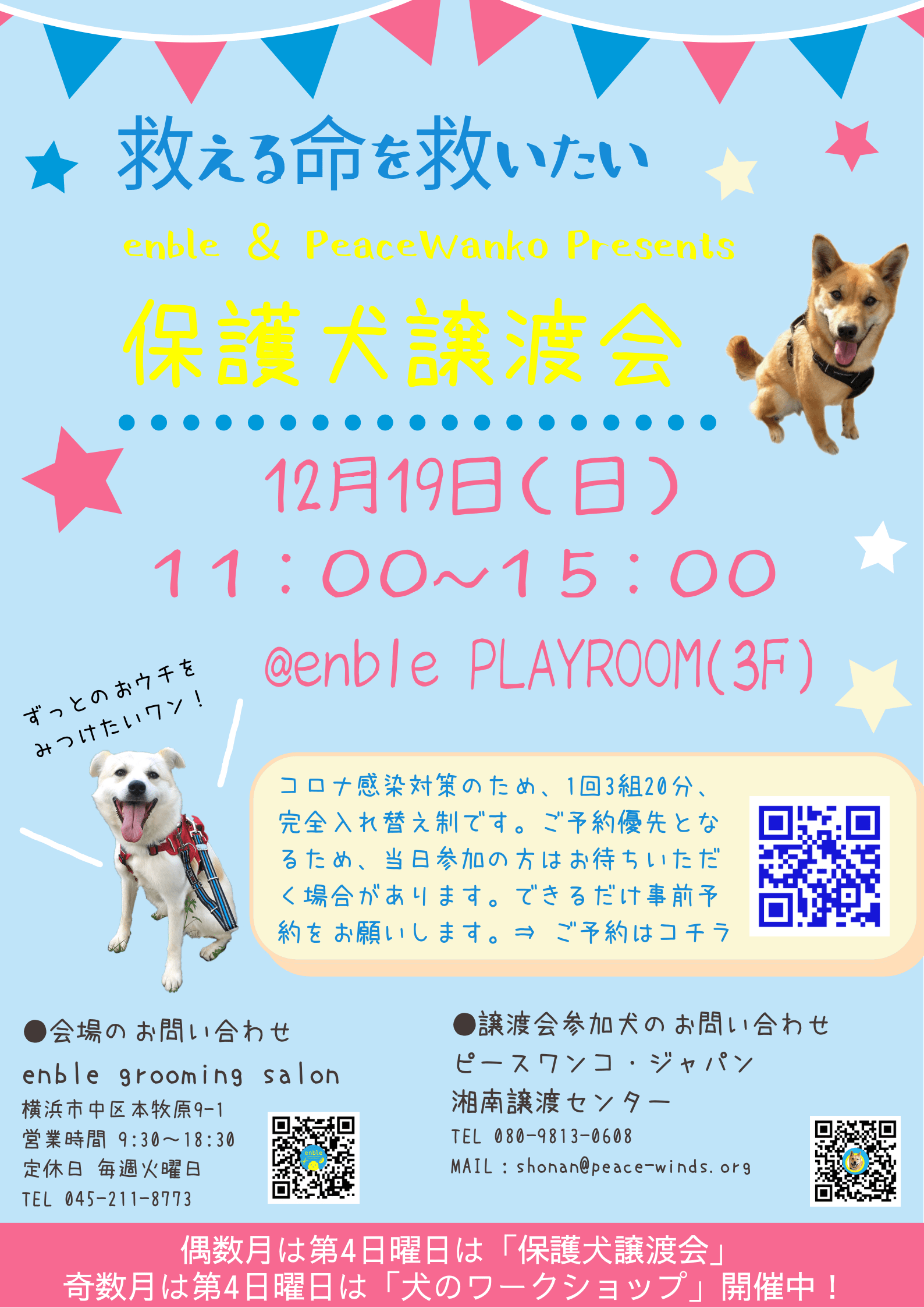 12月19日(日)、コロナ感染防止対策のもと横浜本牧のドッググルーミングサロン「enble(アンブル)」プレイルームで「保護犬譲渡会」を開催し、湘南譲渡センターと世田谷譲渡センターの里親募集中のワンコが参加します。一頭でも多くのワンコが家族に出会えるよう、お近くの方はぜひご来場ください。ご予約優先となるため、当日参加の方はお待ちいただく場合がありますので、できるだけ事前予約をお願いします。
