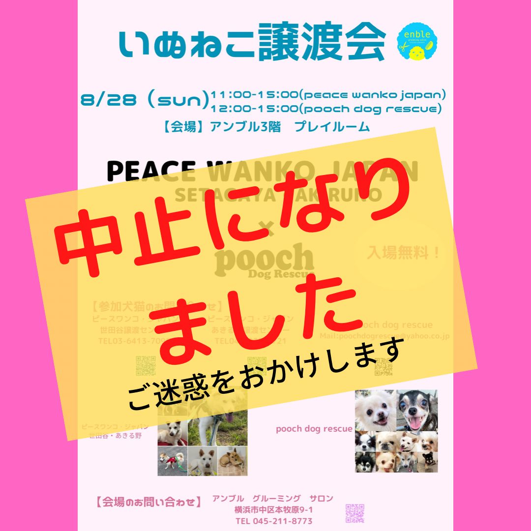 8月28日(日)感染拡大防止のため譲渡会を中止いたします。ご予定くださった皆様誠に申し訳ございません。