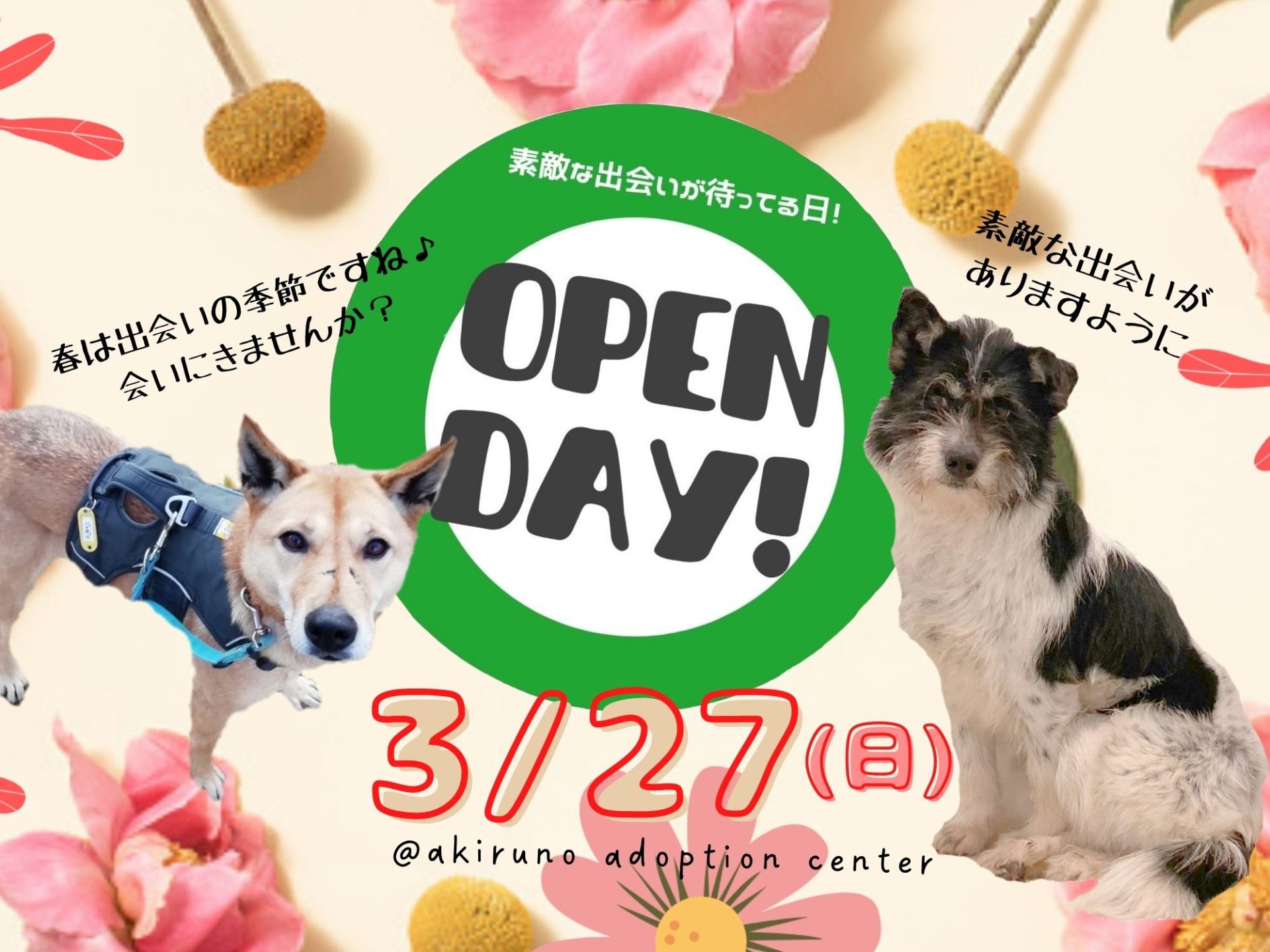 3月27日(日)、あきる野譲渡センターのワンコに会っていただきやすくするために「OPEN Day 第18弾」を開催します。