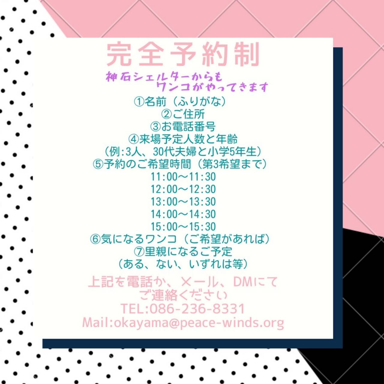 - ※ワンコの体調等考え、一組様30分までとさせて頂きます。 (その後、犬舎内のご見学も可能ですが、他のお客様と重なる場合はお待ちいただく可能性もあります) ※ご希望時間は、他の希望者様と重ならないよう調整させていただく事がありますのでご了承ください。 ※小学生以下のお子様と来場される際は、お子様から目を離さないようお願い致します。 ※コロナウイルス感染拡大防止に伴い、アルコール消毒、マスク着用をお願い致します。当日の体温が37.5度以上の方や体調不良の方の来店はご遠慮ください。 ※緊急事態宣言等が発生した場合、延期とさせて頂きますのであらかじめご了承ください。 その他、ご不明点等ありましたらお気軽にご連絡下さい。