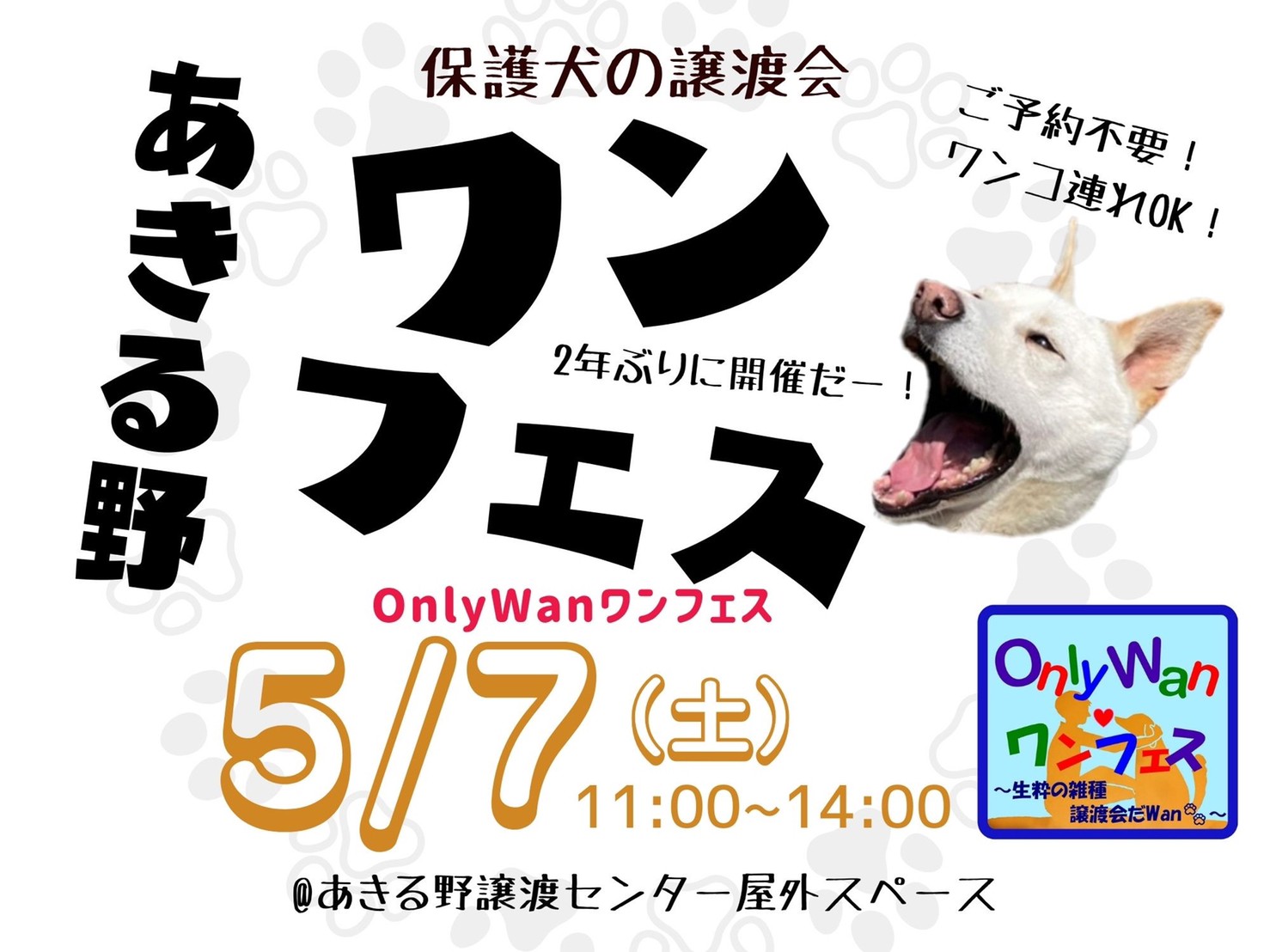 5月7日(土)、あきる野譲渡センターで「Only Wan ワンフェス」を開催します。約2年ぶりに開催!!