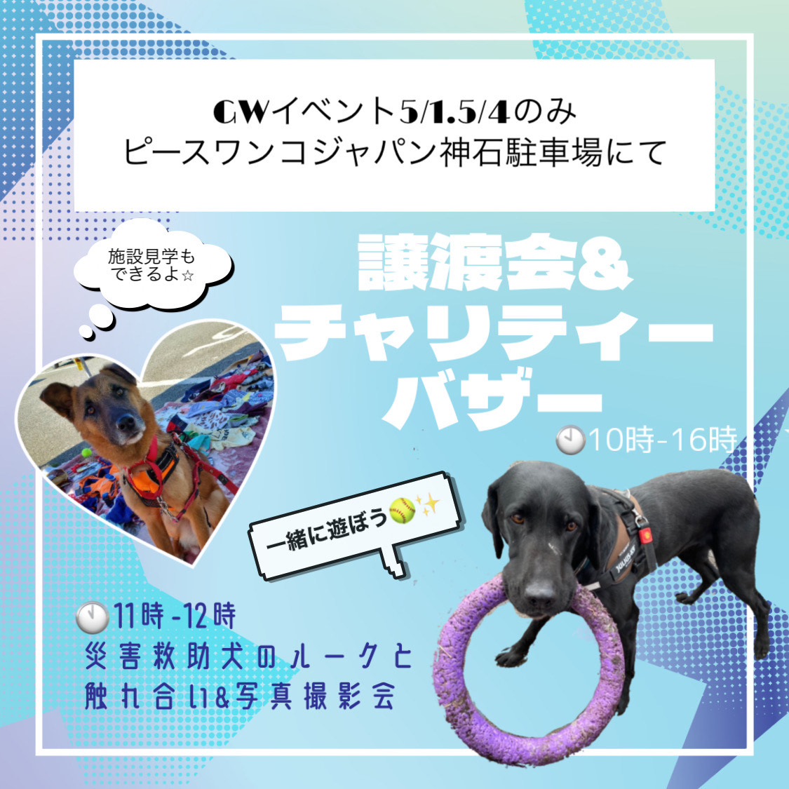 開催時間は10:00~16:00、そのうち11:00~12:00の間は災害救助犬のルークくんとの触れ合い&写真撮影もできます!普段は違うシェルターにいるワンコも参加予定です。保護犬を家族に迎えたいとお考え(水)の皆様、ぜひこの機会にワンコ達に会いに来てください!