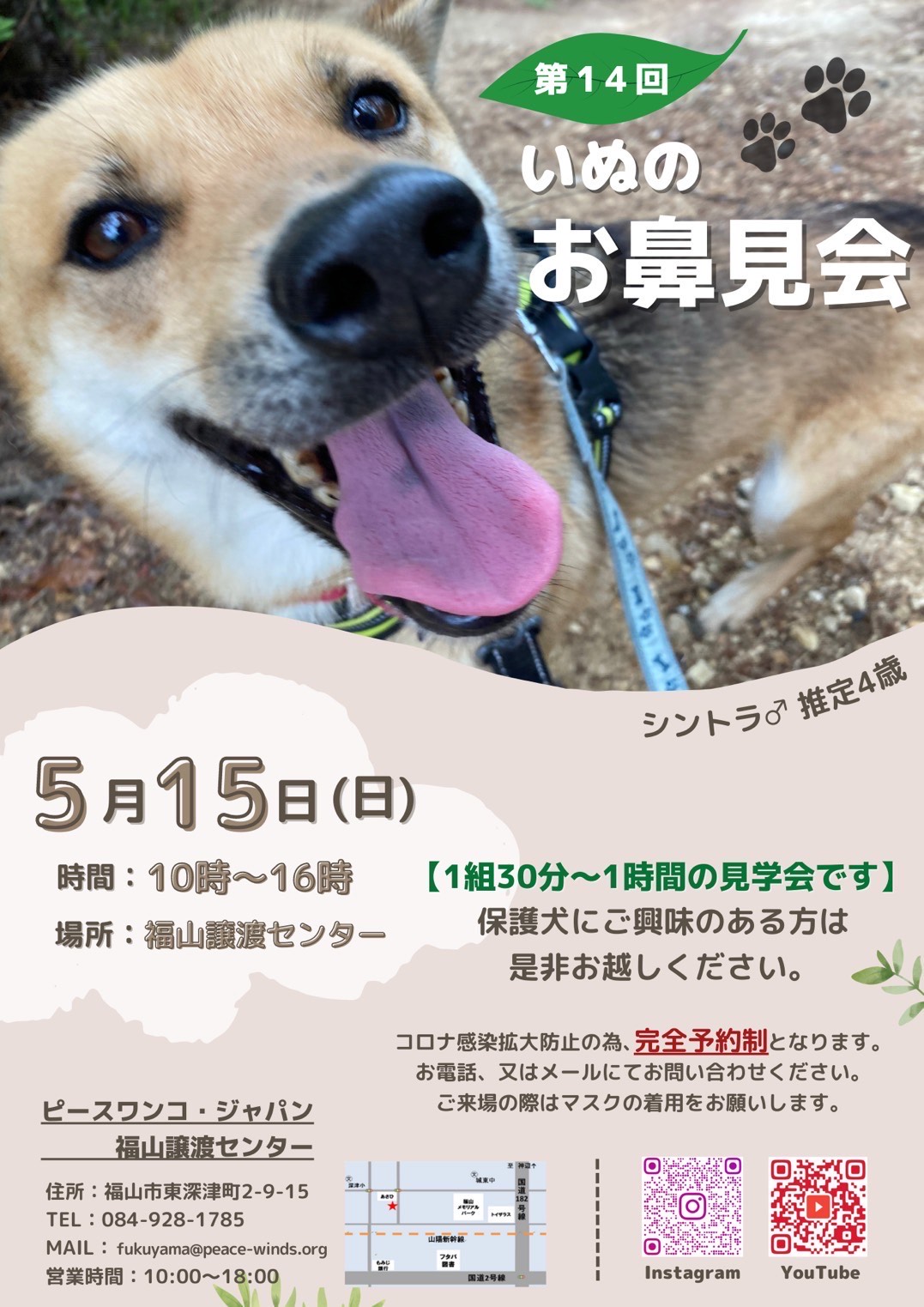 5月15日(日)、ピースワンコ・ジャパン福山譲渡センターで「いぬのお鼻見会」を開催します。センターに在籍しているワンコ達を見学して頂き、保護犬を知っていただく機会にしていただきたいと思います。今回も神石高原シェルターで里親募集をしているワンコが参加します!この機会に是非お越しください。