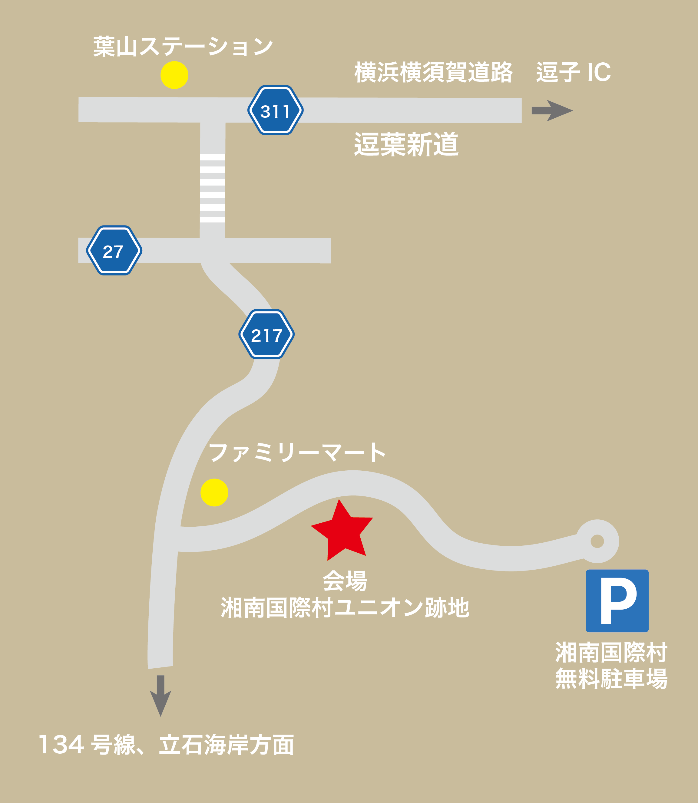 ・駐車場は湘南国際村無料駐車場をご利用ください。路上駐車、周辺施設や住宅地内への無断駐車は固くお断りいたします。