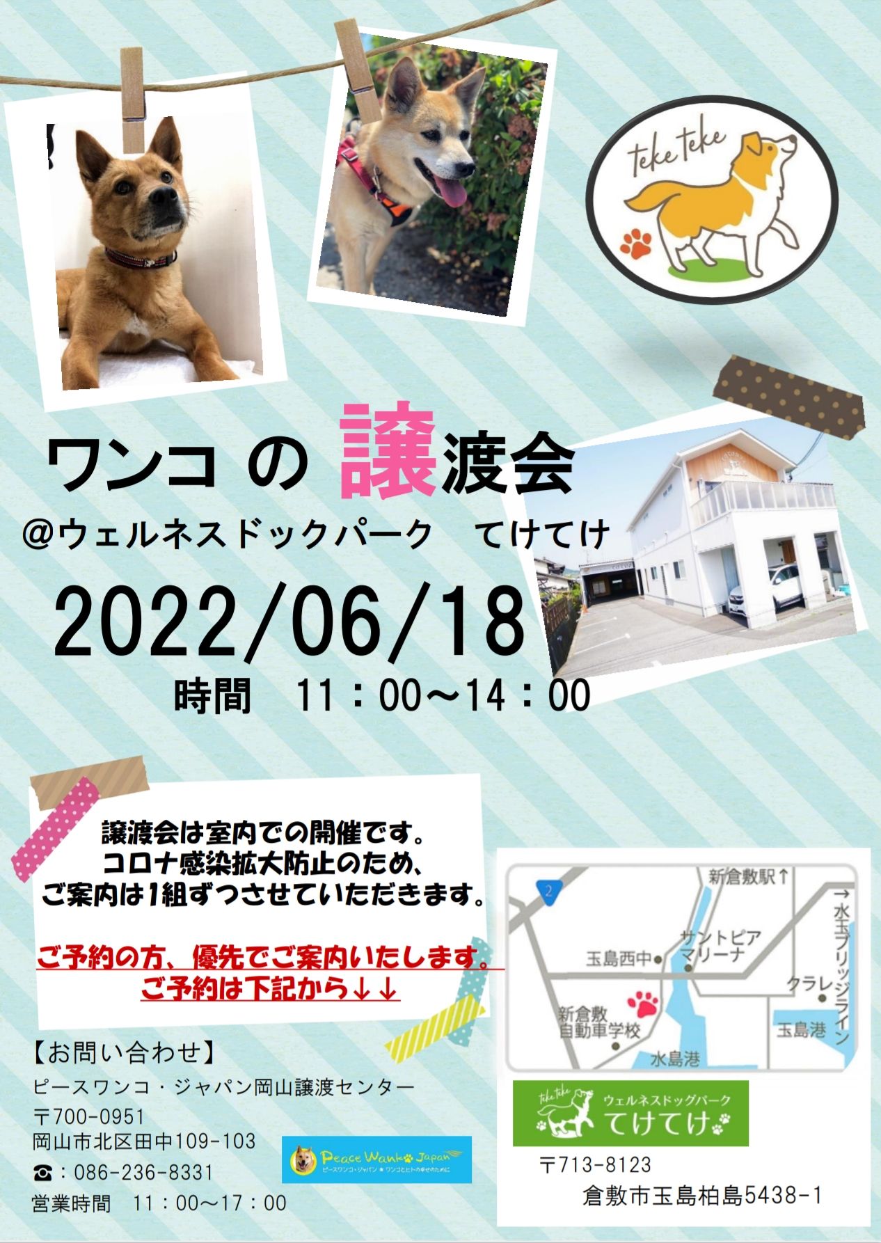 6/18(土)、岡山県倉敷市の「ウェルネスドッグパーク てけてけ」様にて譲渡会を開催させていただきます。
