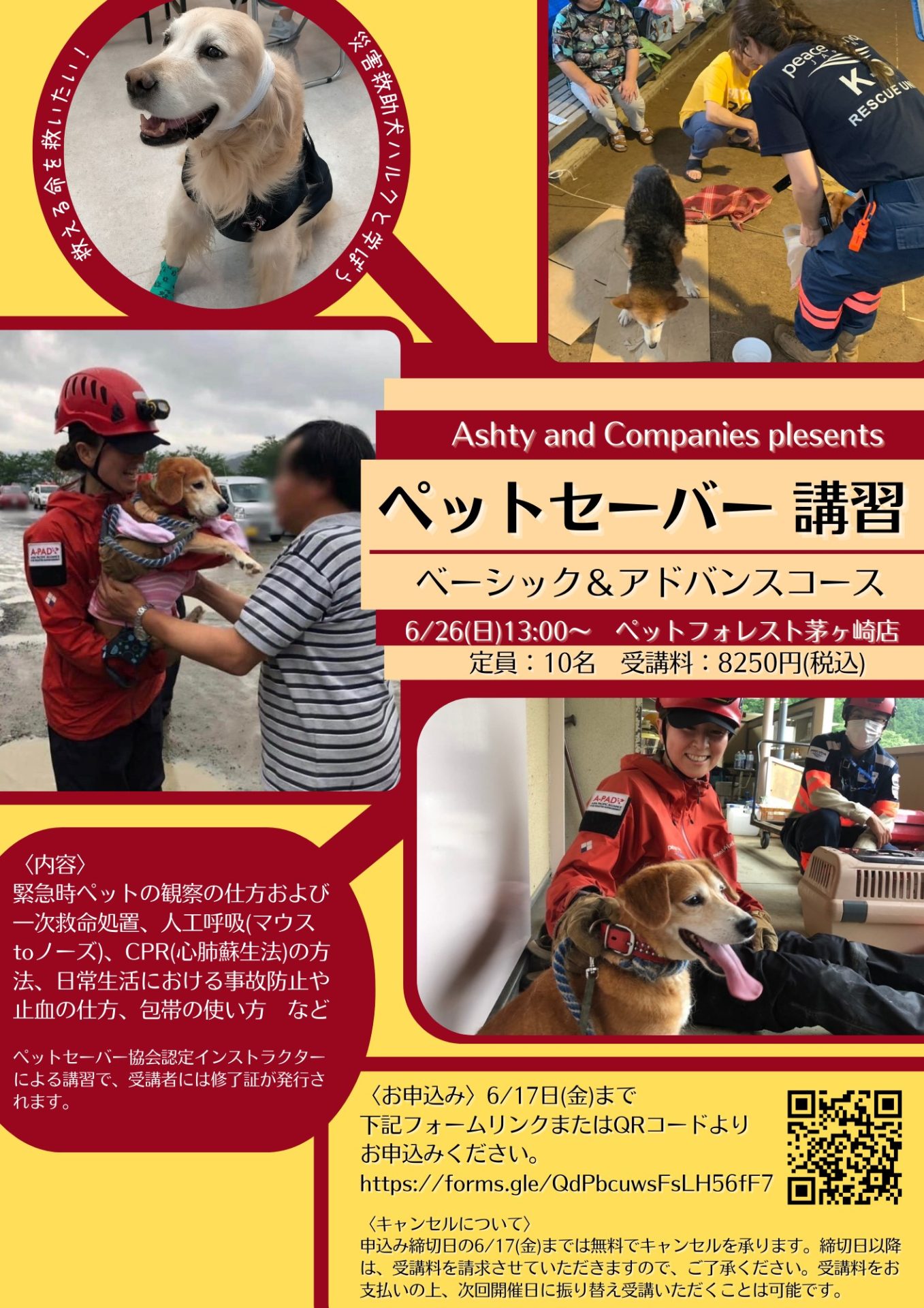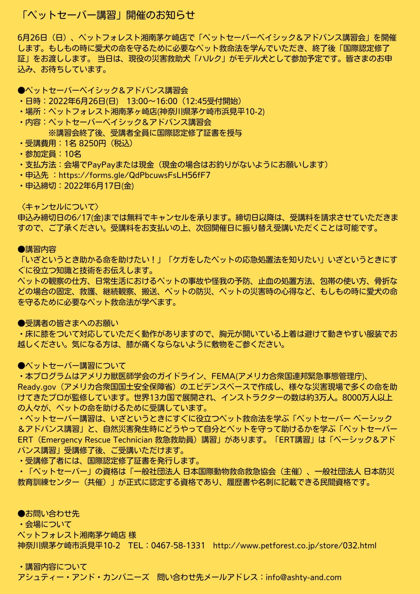 6月26日(日)、ペットフォレスト湘南茅ケ崎店で「ペットセーバーベイシック&アドバンス講習会」を開催します。もしもの時に愛犬の命を守るために必要なペット救命法を学んでいただき、終了後「国際認定修了証」をお渡しします。 当日は、現役の災害救助犬「ハルク」がモデル犬として参加予定です。皆さまのお申込み、お待ちしています。