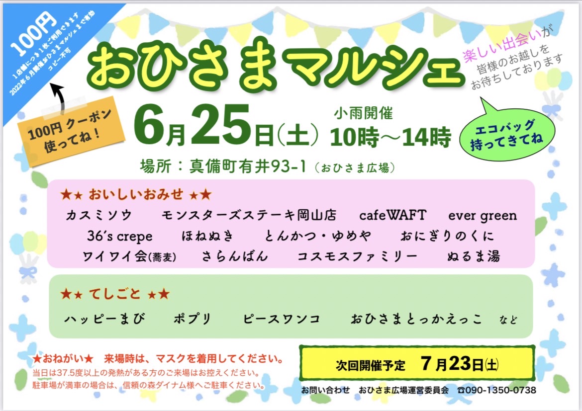 6/25(土)、岡山県倉敷市で開催される「おひさまマルシェ」に、真備町を盛り上げるべくピースワンコの岡山譲渡センターと神石高原シェルターで里親募集中のワンコたち共に応援にいきます。当日は飲食ブースなども出店されますので、ご家族皆さまで是非お立ち寄りください。