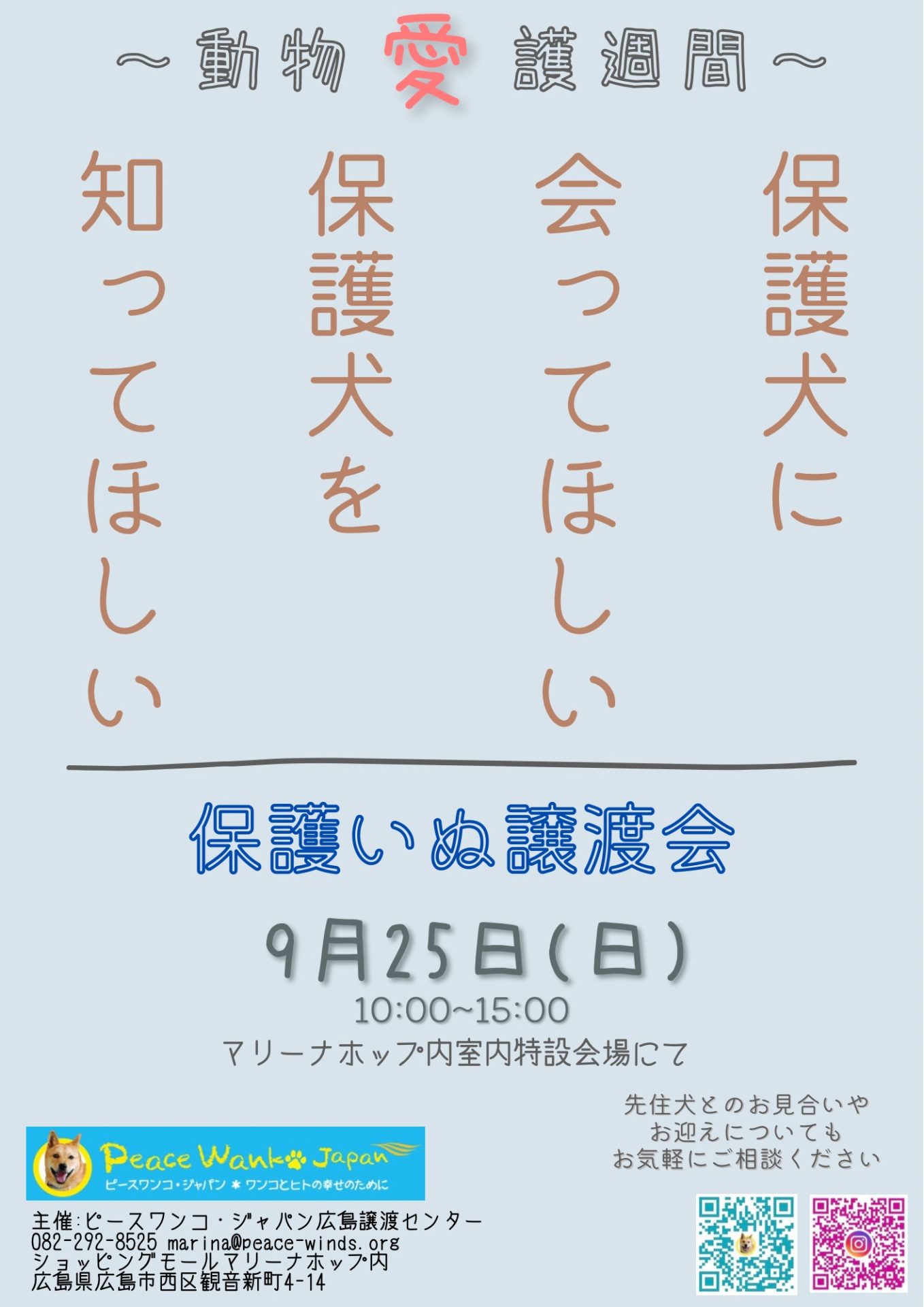 - 《ご予約フォーム》https://forms.gle/UFiVfih7MxpKq7hd7《メール》 marina@peace-winds.orgまで、下記項目をご明記の上お送りください 氏名、年齢、ご人数様、ご希望のお時間、お電話番号、飼養を検討中かそうでないか 《お電話》 082-292-8525