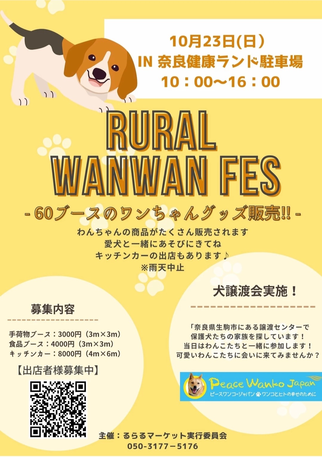 10/23(日)奈良健康ランドの駐車場で開催されるRURAL WANWAN FES(※雨天中止)はワンコ関連のブースが60程参加されるイベントです。