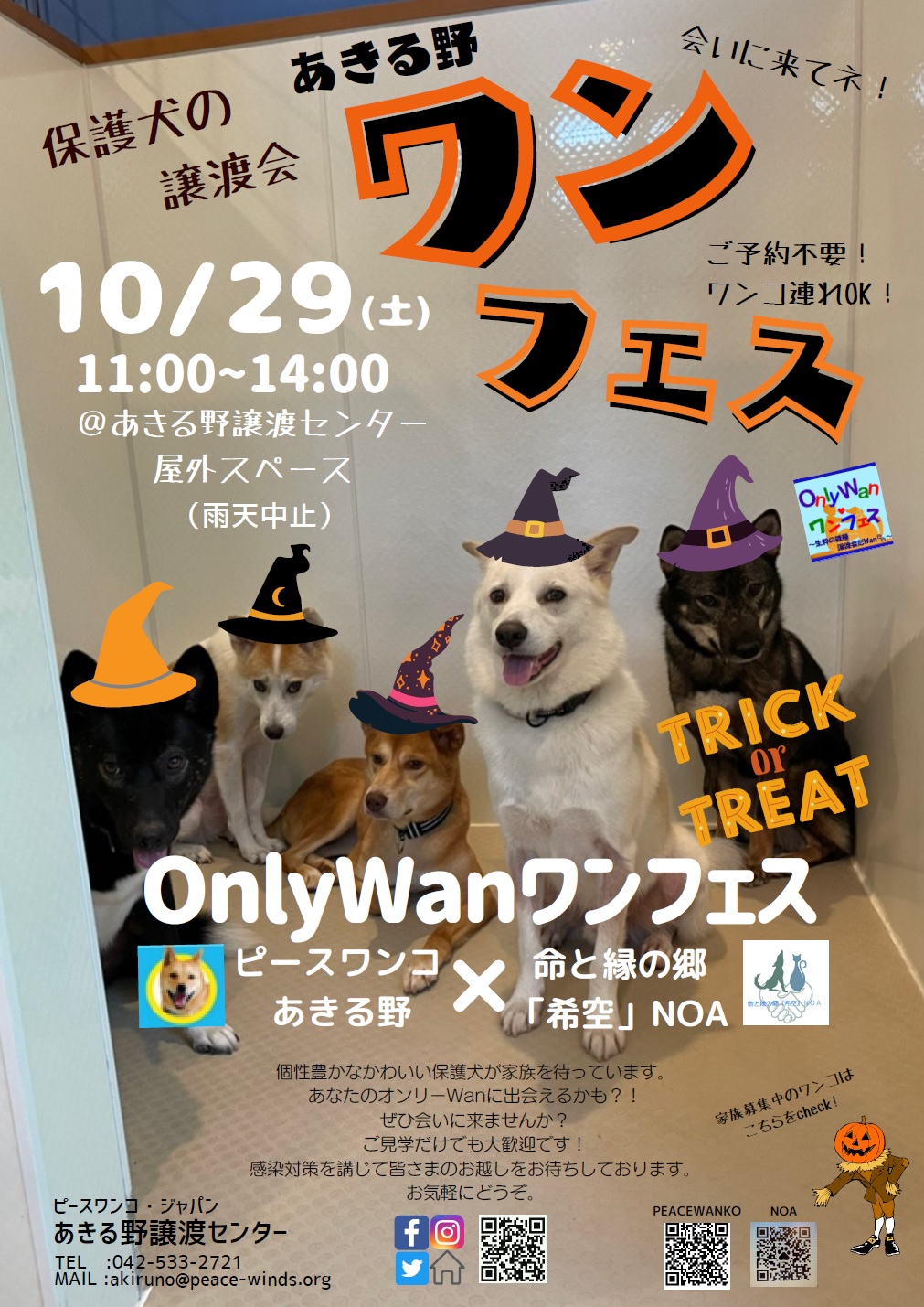 10月29日(土)、あきる野譲渡センターで犬の譲渡会「Only Wan ワンフェス」を開催します。個性豊かで愛嬌たっぷりなワンコたちの中から、あなたの「オンリーワン」と出会う場所になるよう、スタッフがサポートします。