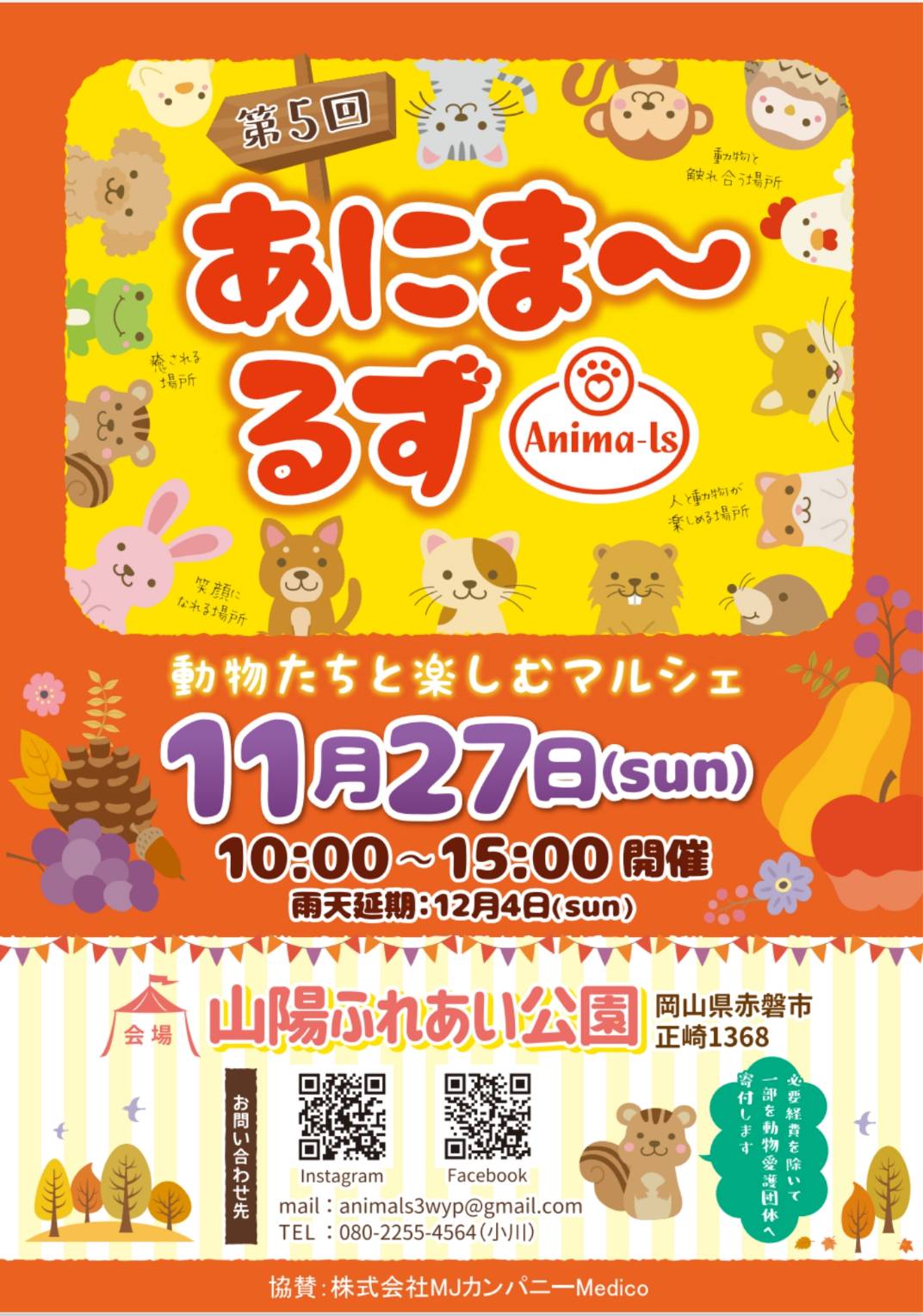 11月27日(日)、岡山県赤磐市の山陽ふれあい公園にて開催の「第5回あにま~るず 動物たちと楽しむマルシェ」に岡山譲渡センター・神石高原シェルターで里親募集中のワンコ数頭が参加します。