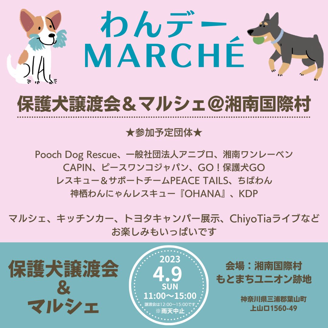 【ピースワンコの譲渡会】4/9(日)【わんデーmarché 保護犬の譲渡会】開催(神奈川 湘南国際村)