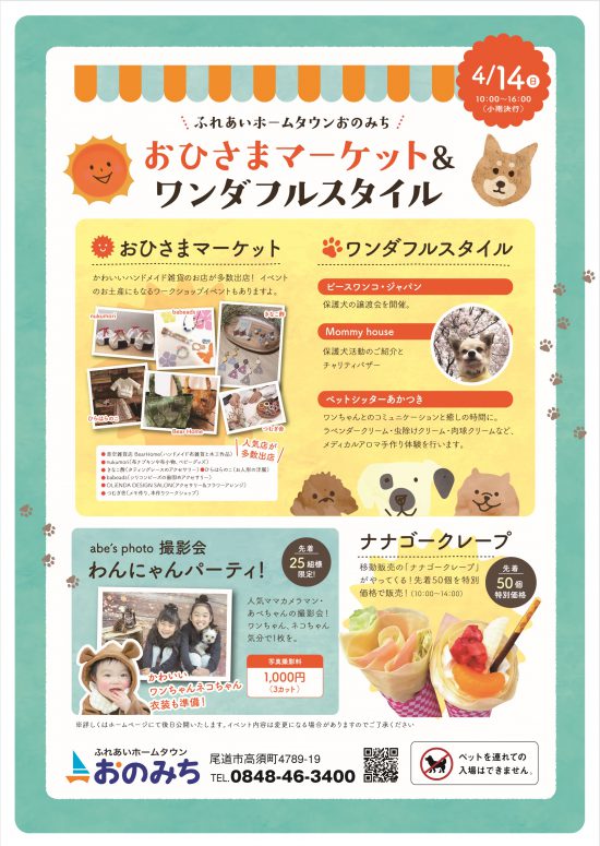 4/14(日)、東尾道の幹線道路沿いにある住宅展示場・ふれあいホームタウンおのみちで開催される「おひさまマーケット&ワンダフルスタイル」に、神石高原シェルターの保護犬たちも参加します。ピースワンコの譲渡会ブースでは、コーヒーや犬用のジャーキー、カレンダーなども販売する予定です。会場には手作り雑貨のお店やワークショップ、写真撮影会などもあります。ぜひご家族そろってお越しください。