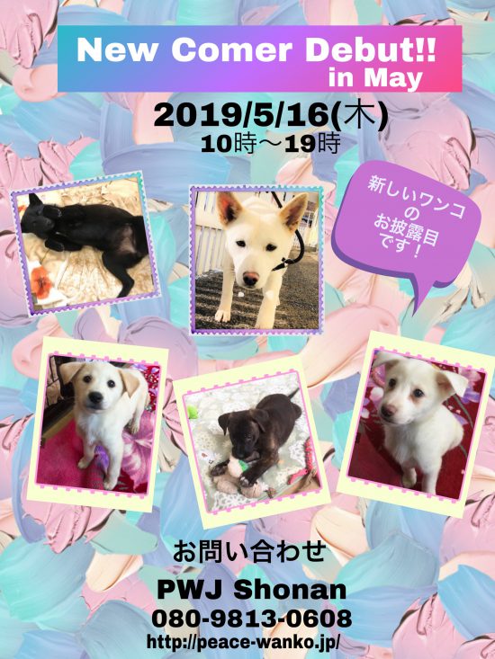 5/16(木)から湘南譲渡センターで、新入りワンコのお披露目会「NewComer Debut!! on MAY」を開催いたします。広島県の神石高原シェルターから来た「そうし」「かりん」「マイラン」「ニーチャ」「オルタ」の5頭がデビュー!