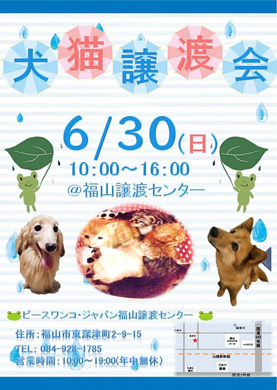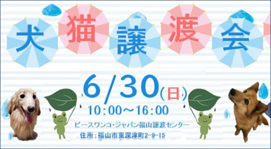 6月30日(日)、福山譲渡センターで定期譲渡会「いぬねこ譲渡会」を開催します。コロコロの可愛い仔犬から個性豊かな成犬まで様々なワンコが参加します。ピースワンコのほかに他団体さんから、小型犬や子猫も参加予定です。ぜひご家族でお越しください!