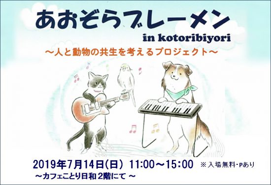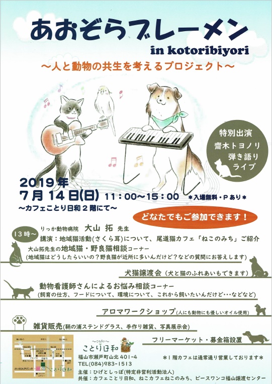 7月14日、福山市の“カフェことり日和”で開催される譲渡会「あおぞらブレーメン」に参加します。当日は譲渡会だけでなく、獣医師による地域猫についての講演や雑貨販売、フリーマーケット、チャリティーライブなど様々なイベントが開催されます。1階のカフェでは身体に優しい素材やオーガニックにこだわった美味しいお料理も楽しめますよ。ぜひご家族でお越しください。