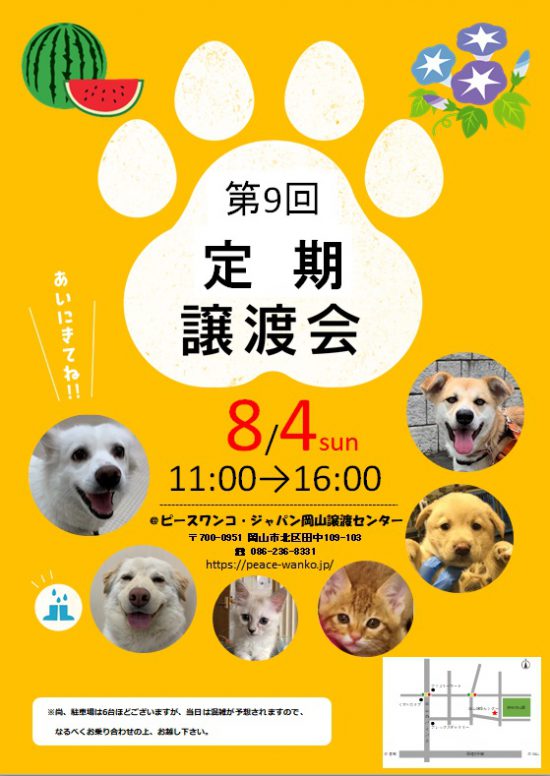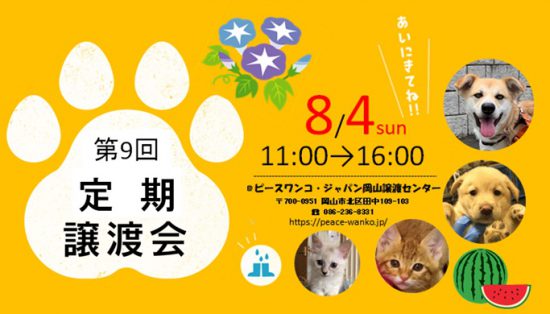 8月4日(日)、岡山譲渡センターで第7回定期譲渡会を開催いたします。ワンコとヒトの幸せのために…をコンセプトに、毎月第一日曜日に開催している定期譲渡会です。