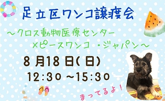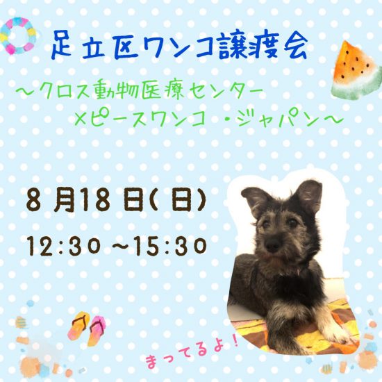 8月18日(日)、クロス動物医療センター足立で「第9回 足立区ワンコ譲渡会」を開催いたします。クロス動物医療センターとピースワンコ・ジャパンでは、殺処分ゼロを目指し、1頭でも多くの保護動物が温かい家庭に迎えられるように定期譲渡会を開催しています。