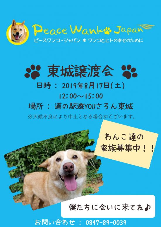 8月17日(土)、広島県の道の駅 遊YOUさろん東城にて譲渡会を開催いたします。神石高原シェルターで里親さんとの出会いを待ちながら暮らしている、個性的で可愛いワンコたちにぜひ会いにお越しくだださい。皆様のご来場、お待ちしています。