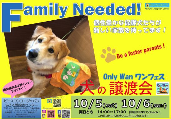 【譲渡会】10/5(土)-6(日)「Only Wan ワンフェス」開催(東京・あきる野)