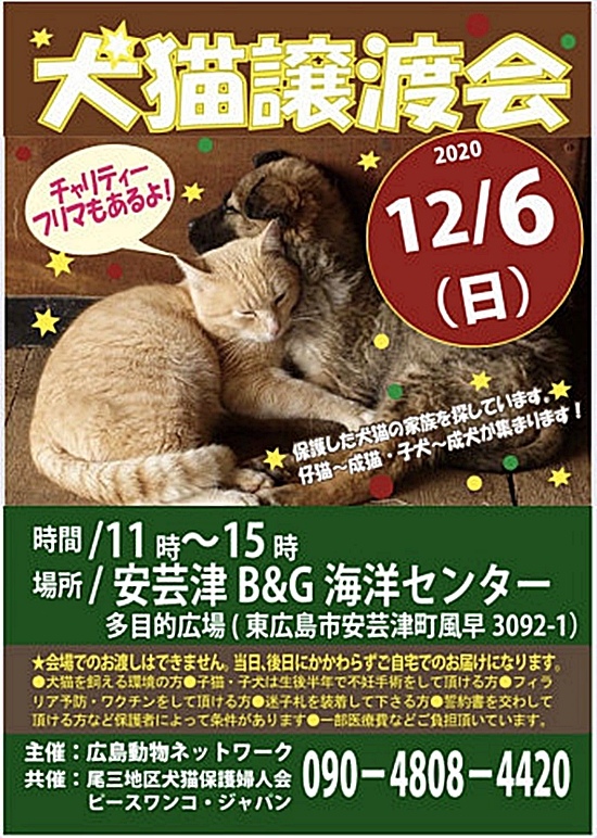 12月6日(日)、広島市の安芸津B&G海洋センターで開催される「犬猫譲渡会」に参加します。当日は神石高原シェルターの検疫犬舎で里親募集中のワンコ3頭が参加予定です。会場内ではチャリティフリマもあります。お近くの方はぜひご来場ください。