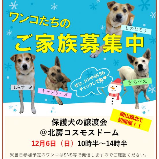 12月6日(日)、岡山県真庭市の北房コスモスドームで「保護犬の譲渡会」を開催します。当日は、福山譲渡センターと岡山譲渡センターで里親募集中のワンコ数頭参加予定です。岡山県真庭市で初の譲渡会実施です。保護犬に会ってみたい方、興味がある方はぜひお気軽にお越し下さい。
