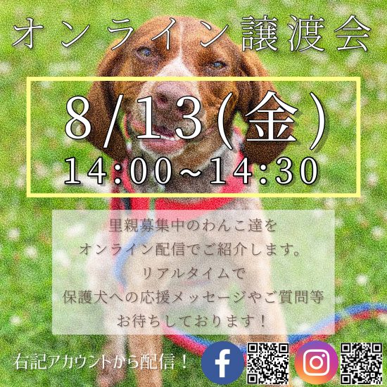 8月13日(金)、14時からオンライン譲渡会を開催し、広島譲渡センターで里親募集中のワンコから3~5頭をご紹介します。家族に出会えるよう、得意なことや苦手なことを本音でご紹介します!ライブ配信ですので毎日わんこのお世話をしているスタッフともリアルタイムでお話ができる機会です。ご来場を迷われている方、ご遠方の譲渡を希望されている方など、広島譲渡センターのSNSのコメントへ保護犬へのメッセージやご質問をお寄せください。皆さまのご参加をお待ちしています。