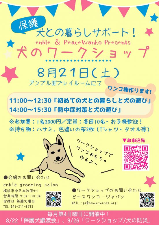 8月21日(土)、横浜本牧のドッググルーミングサロン「enble(アンブル)」プレイルームで、「犬のワークショップ」を2部構成で開催します。