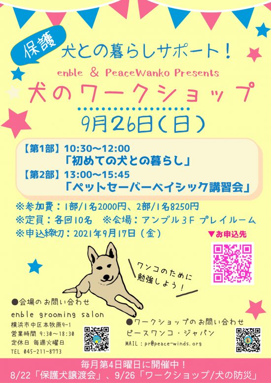 【ピースワンコのイベント】9/26(日)「enble犬のワークショップ」開催(神奈川)