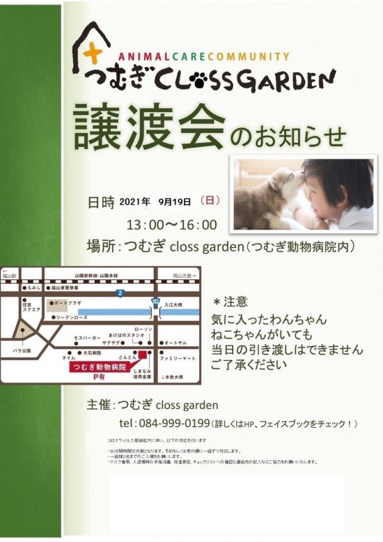 9月19日(日)、福山市のつむぎ動物病院内で開催される「つむぎ closs garden譲渡会」に、ピースワンコ・ジャパン福山譲渡センターで里親募集中のワンコ1頭が参加します。新型コロナウイルス感染拡大防止のため、ご予約制での開催となります。お近くの方はぜひ「つむぎ動物病院」へ電話予約の上、ご来場ください。
