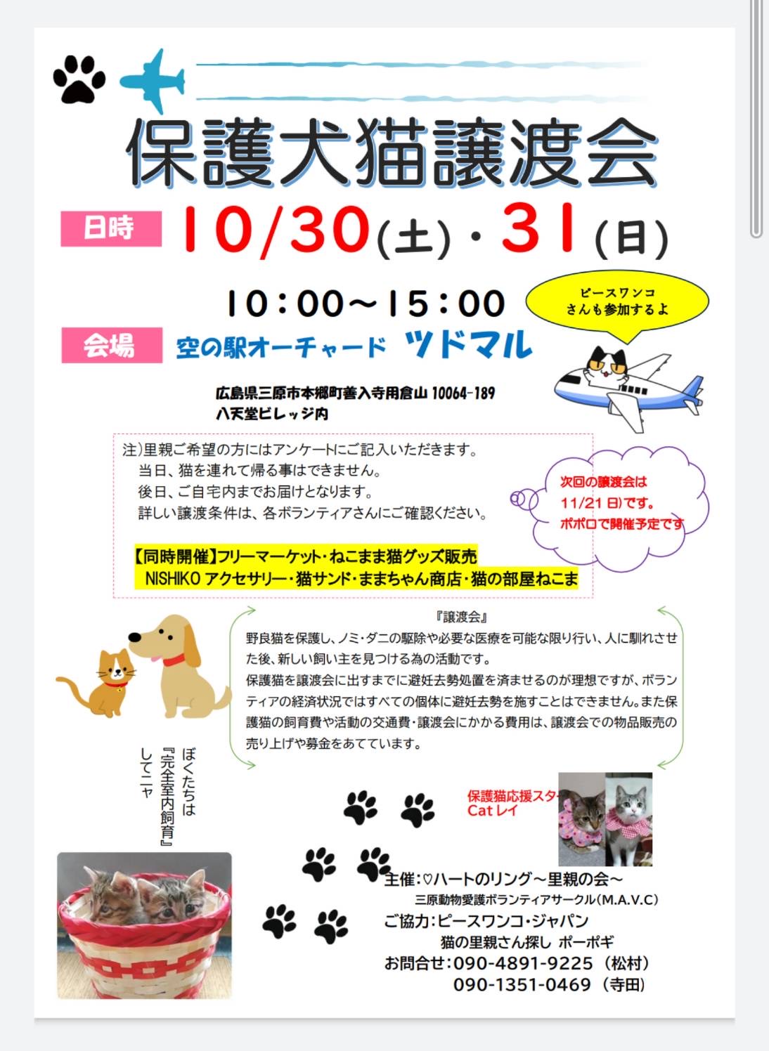 10月30日~31日、広島空港北側の八天堂ビレッジ内 空の駅オーチャードツドマルで開催される「保護犬猫譲渡会」に、神石高原シェルターのワンコ達が家族を探しに参加します。ぜひご来場ください。