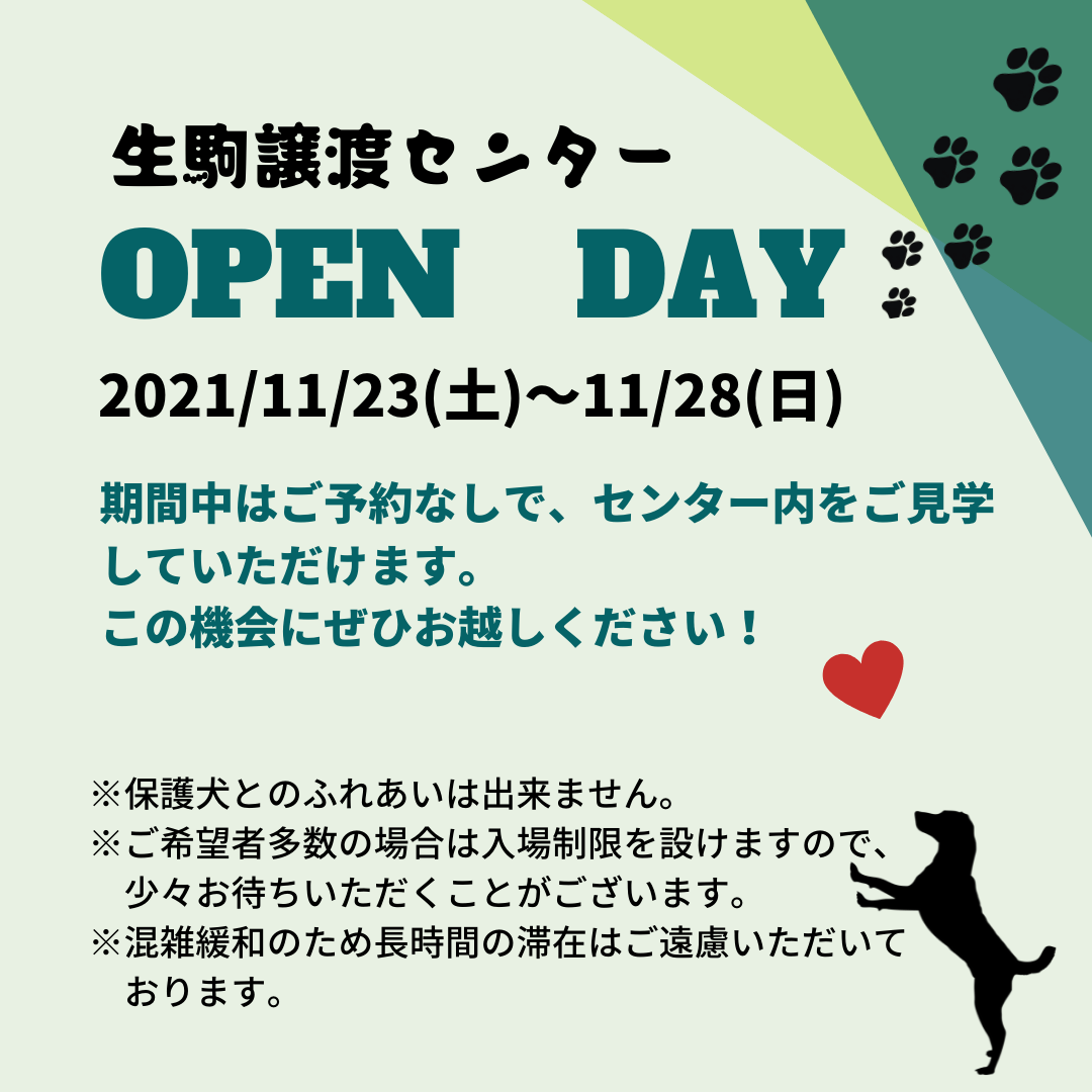 11月23日(火祝)~28日(日)に、先月ご好評だった「オープンデイと保護犬セミナー」を今月も生駒譲渡センターで開催します。期間中はご予約なしで、譲渡センター内を気軽にご見学いただけます。気になっていたけれど機会がなかったという方、ぜひこの期間にご見学にお越しください。