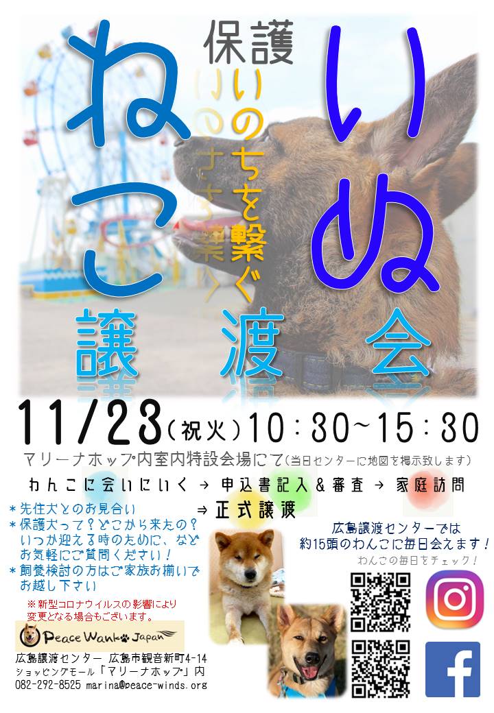 11月23日(火祝)、広島譲渡センター で「会える!いぬねこ譲渡会」を開催します。この日だけ特別に、神石高原シェルター から来るわんこ約10~15頭に会って頂けます。他団体様からもわんこにゃんこの参加、いぬねこグッズやおやつなどの販売も行います。先住犬がいる方はお見合いができますので、先住犬をお連れください。保護犬との暮らしを検討される方は、ご家族揃ってのご来場をお勧めいたします。