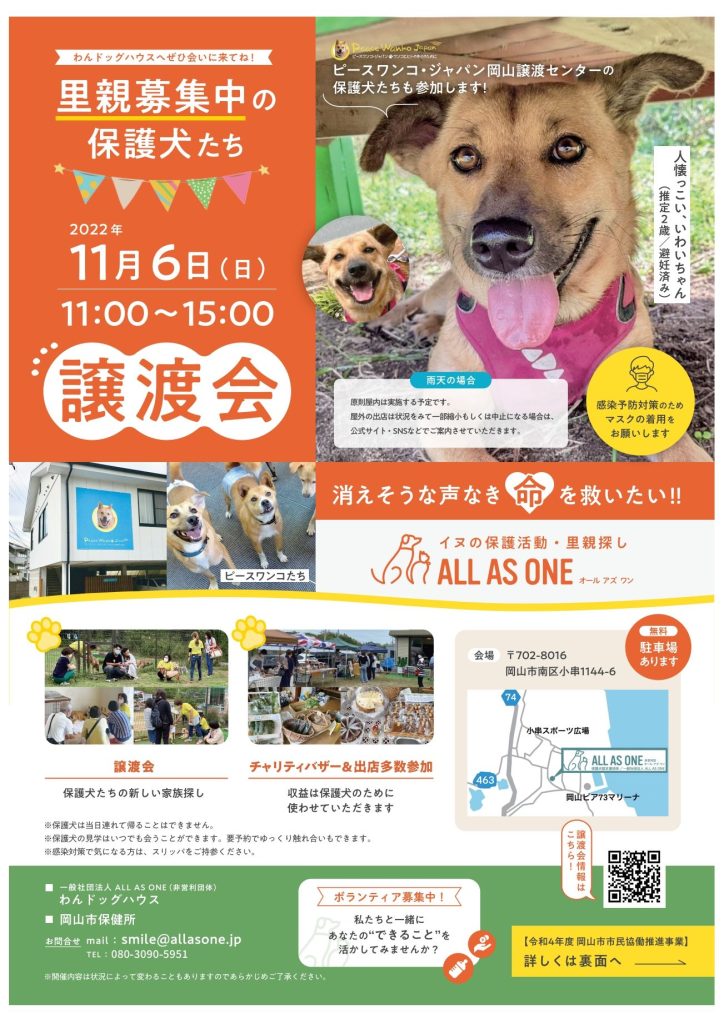 【ピースワンコのイベント】11/6(日)「わんドッグハウス譲渡会」に参加(岡山)