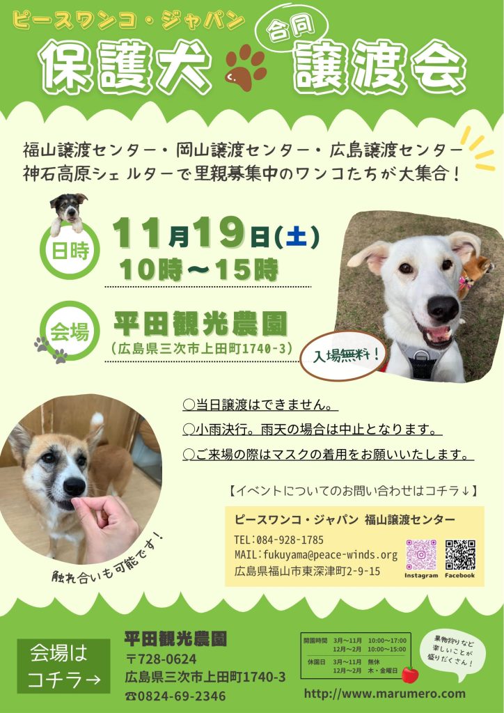 【ピースワンコの譲渡会】11/19(日)「保護犬🐾合同譲渡会」開催(三次市@平田観光農園)