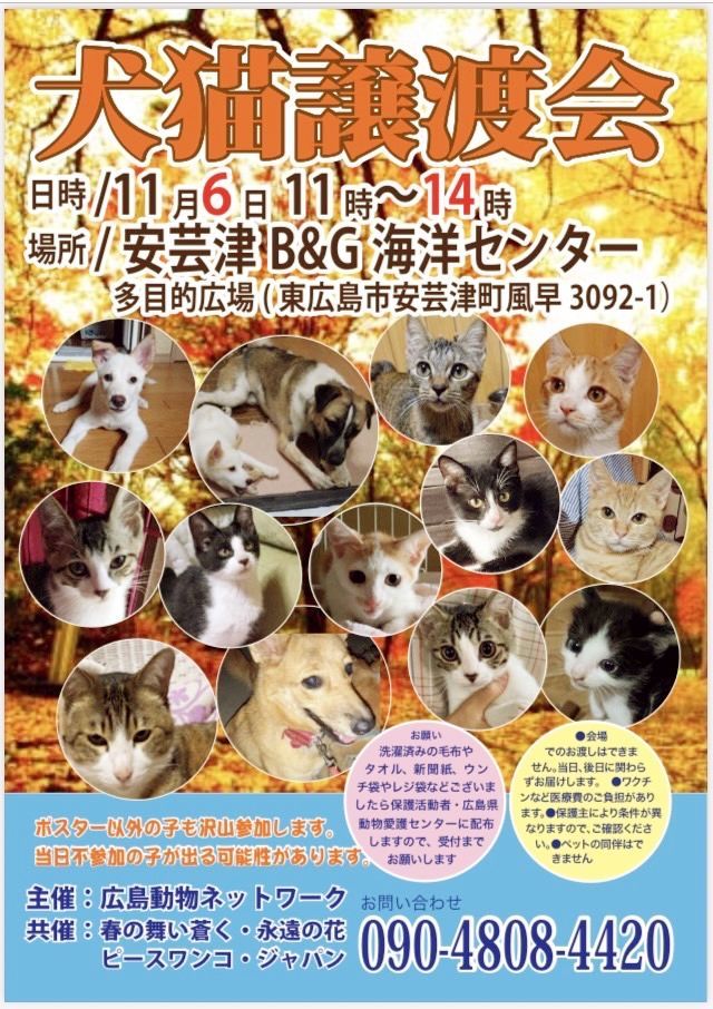 【ピースワンコの譲渡会】11/6(日)「犬猫譲渡会」に参加(広島)