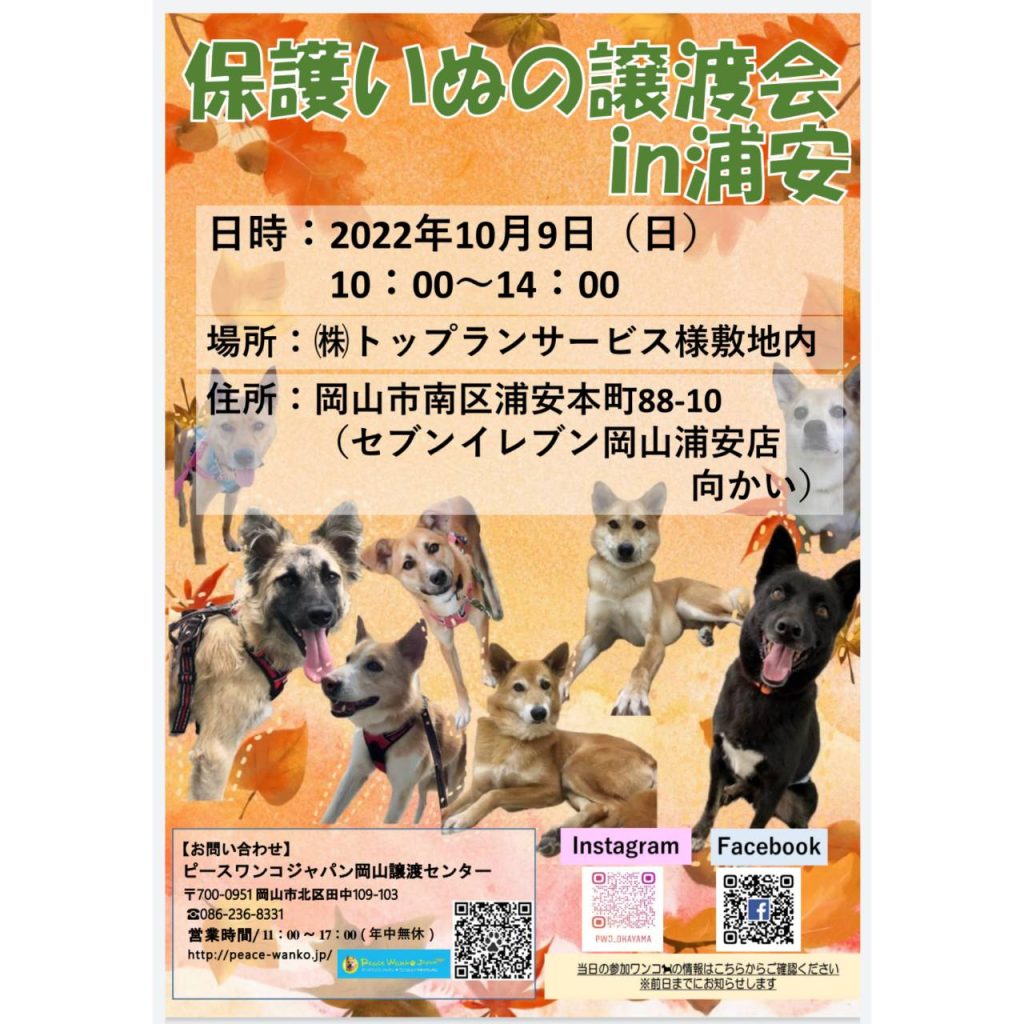 【ピースワンコの譲渡会】10/9(日)「保護いぬの譲渡会 in 浦安 」開催(岡山市)