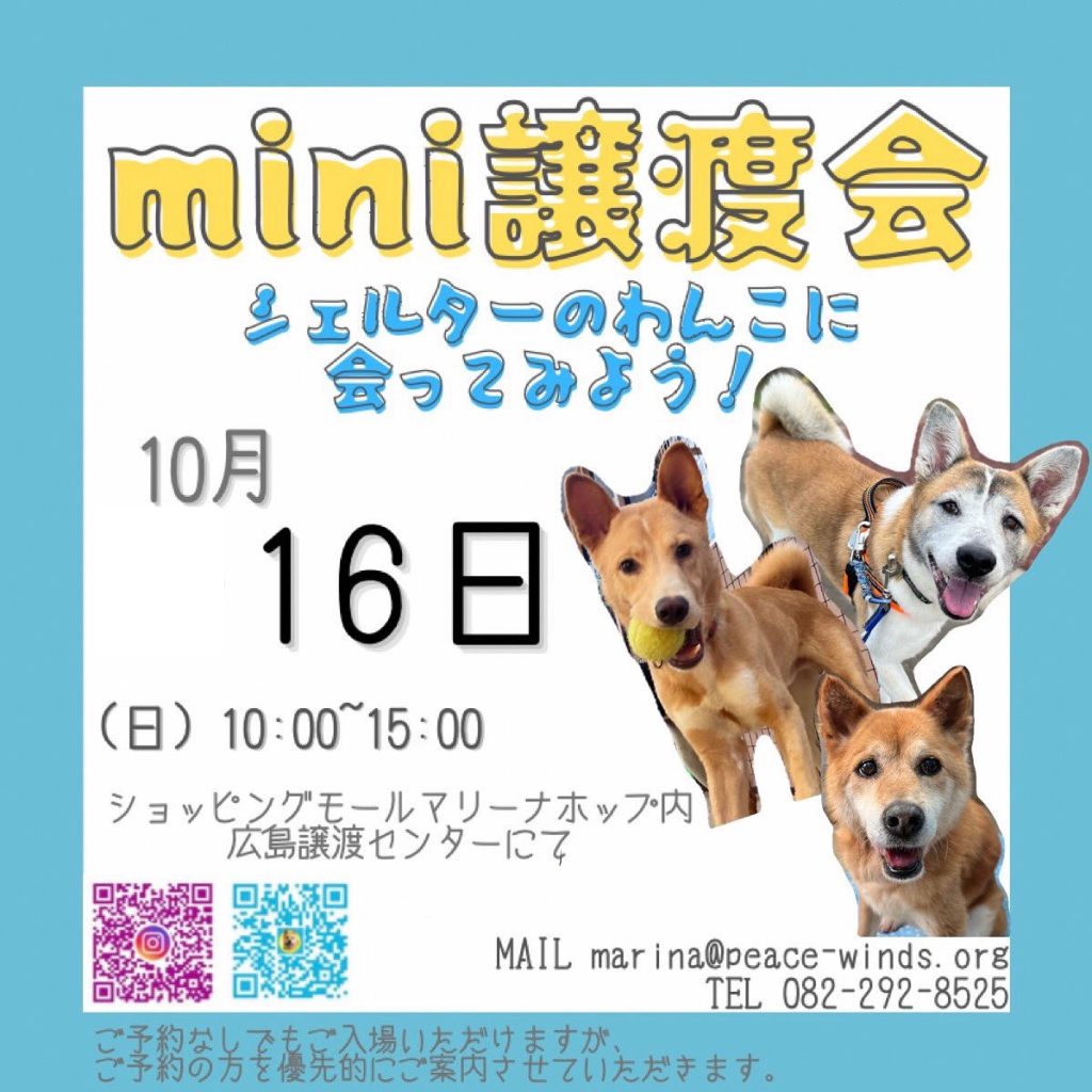 【ピースワンコの譲渡会】10/16(日)「mini譲渡会~シェルターわんこがやってくる!~」(広島譲渡センター)