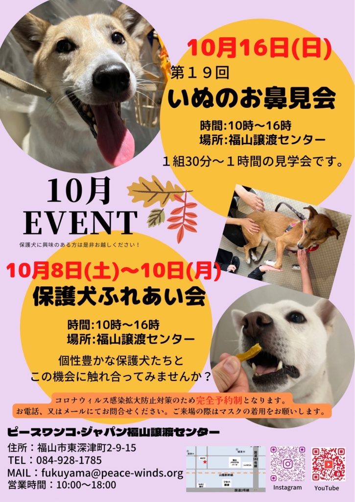 【ピースワンコのイベント】10月イベントのお知らせ>8日(土)~10日(月)・16日(日)(福山譲渡センター)