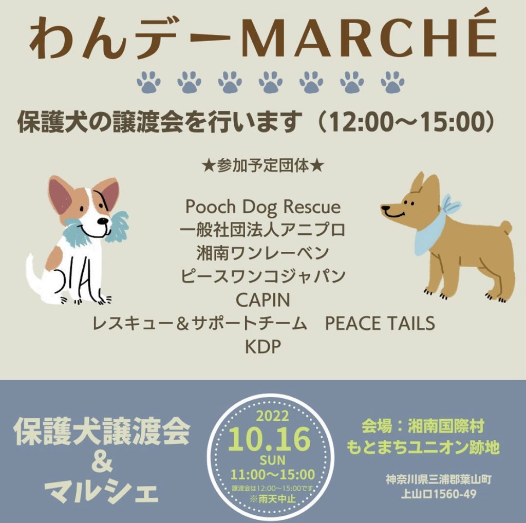 【ピースワンコの譲渡会】10/16(日)【わんデーmarché 保護犬の譲渡会】開催(神奈川 湘南国際村)