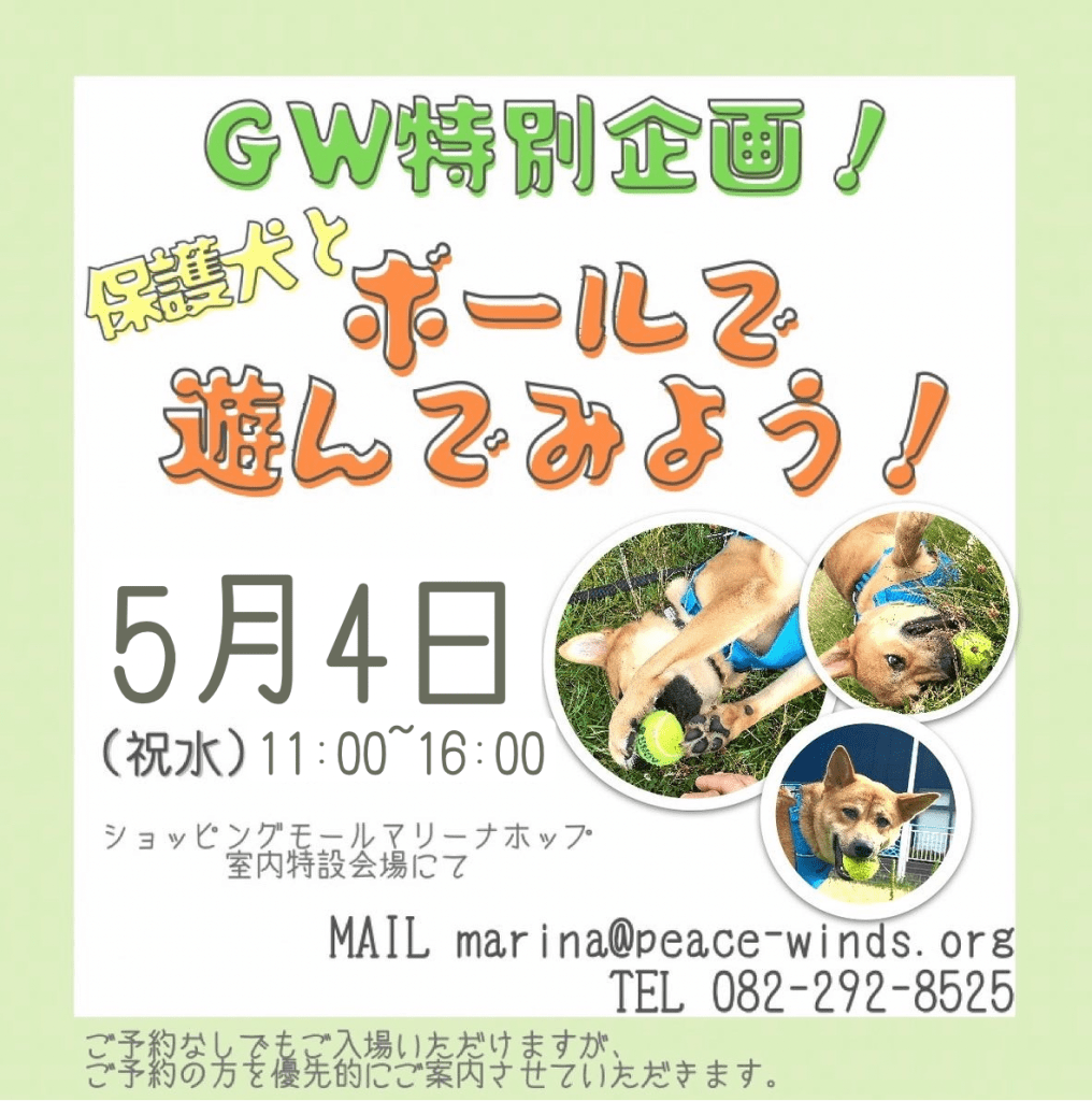 【ピースワンコのイベント】5/4(祝水)「GW特別企画~保護犬とボールで遊んでみよう!~」(広島譲渡センター)