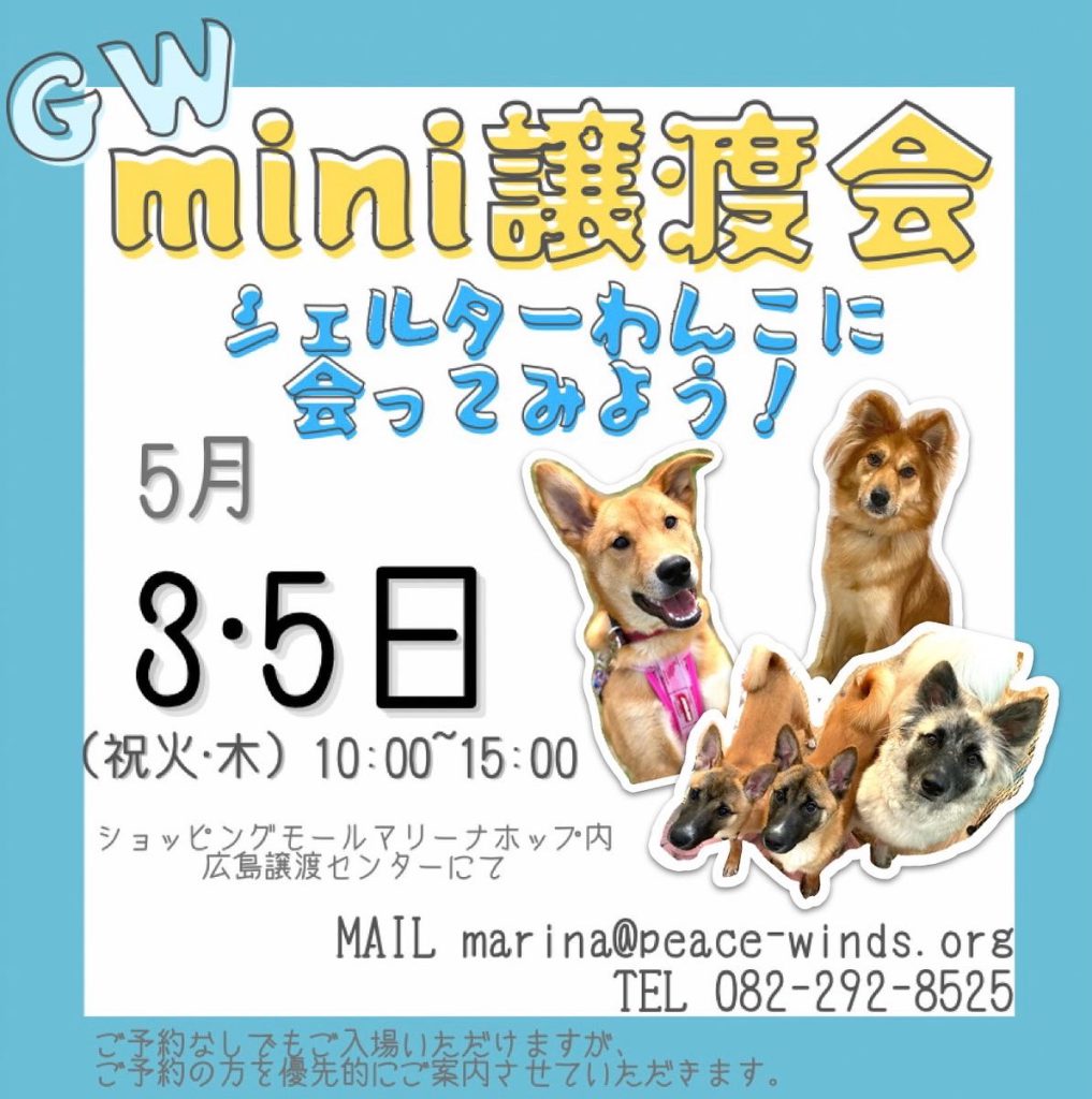 【ピースワンコの譲渡会】5/3・5(祝火木)「mini譲渡会~シェルターわんこがやってくる!~」(広島譲渡センター)