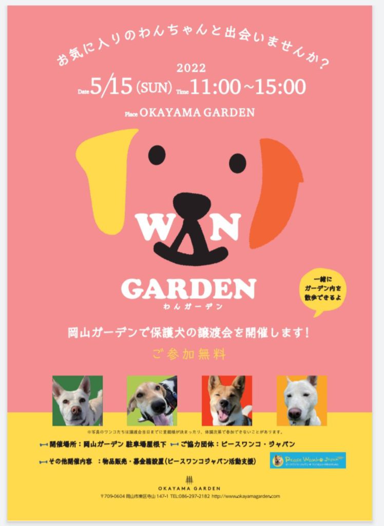 【ピースワンコの譲渡会】5/15(日)「わんガーデン」(岡山)