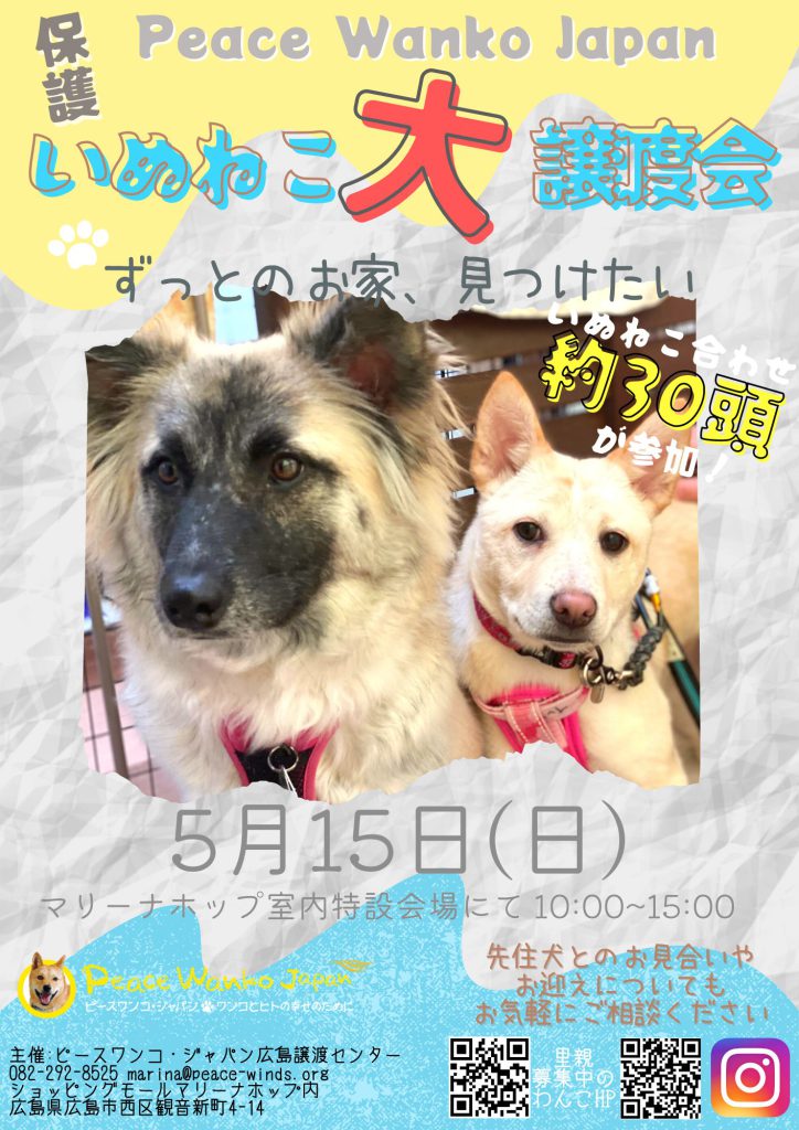 【ピースワンコの譲渡会】5/15(日)「保護いぬねこ大譲渡会〜ずっとのお家、見つけたい〜」(広島譲渡センター)