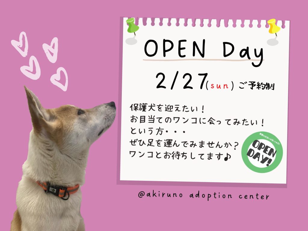 【ピースワンコのイベント】2/27(日)「OPEN Day☆素敵な出会いが待ってる日」開催(あきる野譲渡センター)