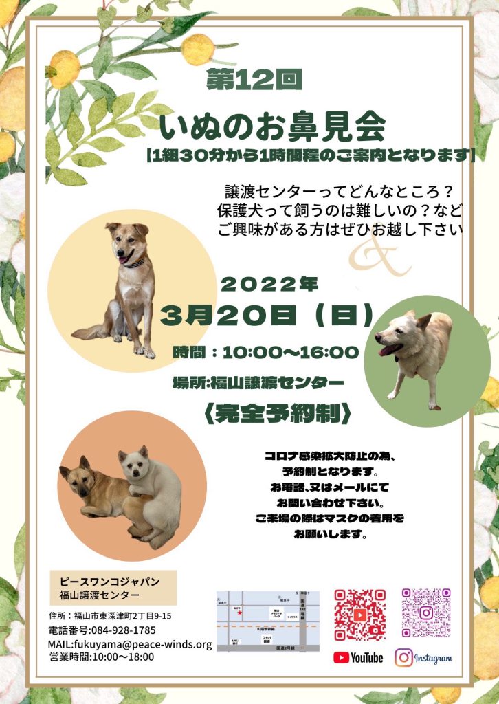 【ピースワンコの譲渡会】3/20(日)「第12回いぬのお鼻見会」開催(福山譲渡センター)