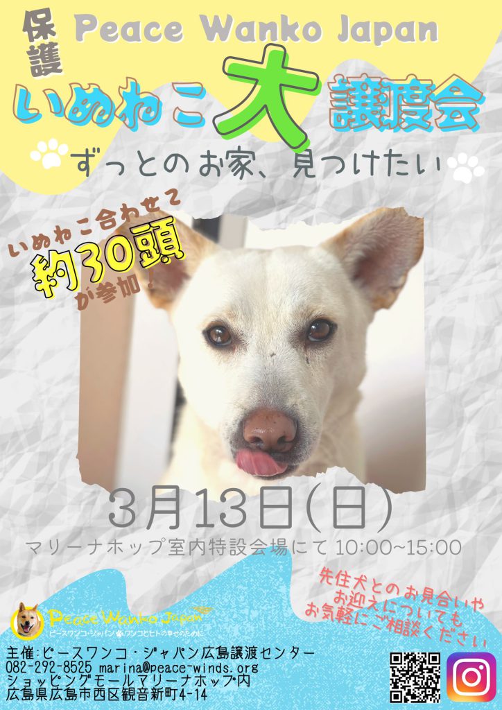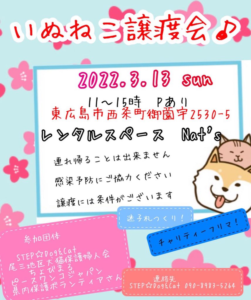 【ピースワンコの譲渡会】3/13(日)「いぬねこ譲渡会」に参加(広島)
