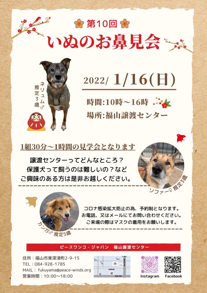 【ピースワンコの譲渡会】1/16(日)「第10回いぬのお鼻見会」開催(福山譲渡センター)