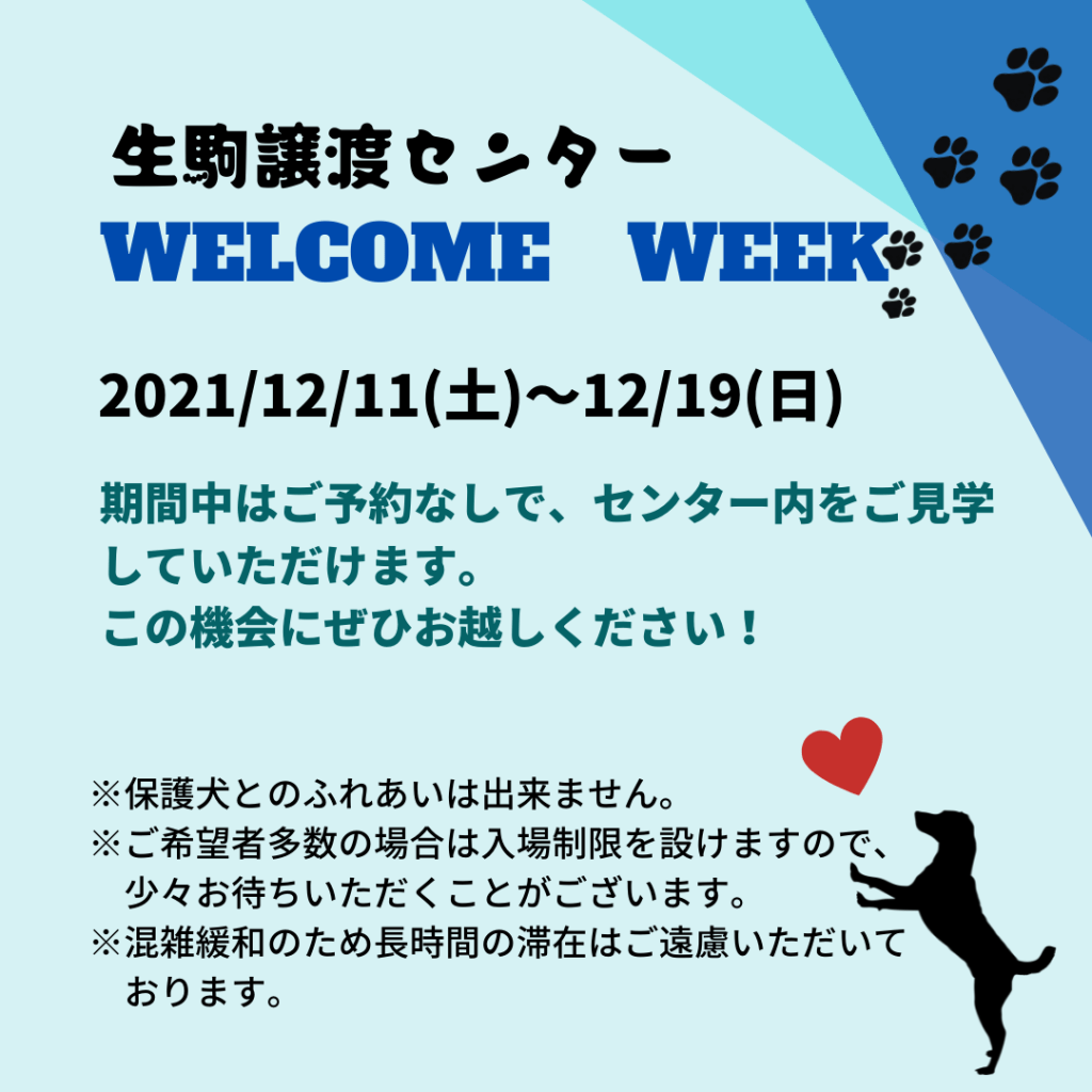 【ピースワンコのイベント】12/11(土)-12/19 (日)「WELCOME WEEK」開催 (生駒譲渡センター)